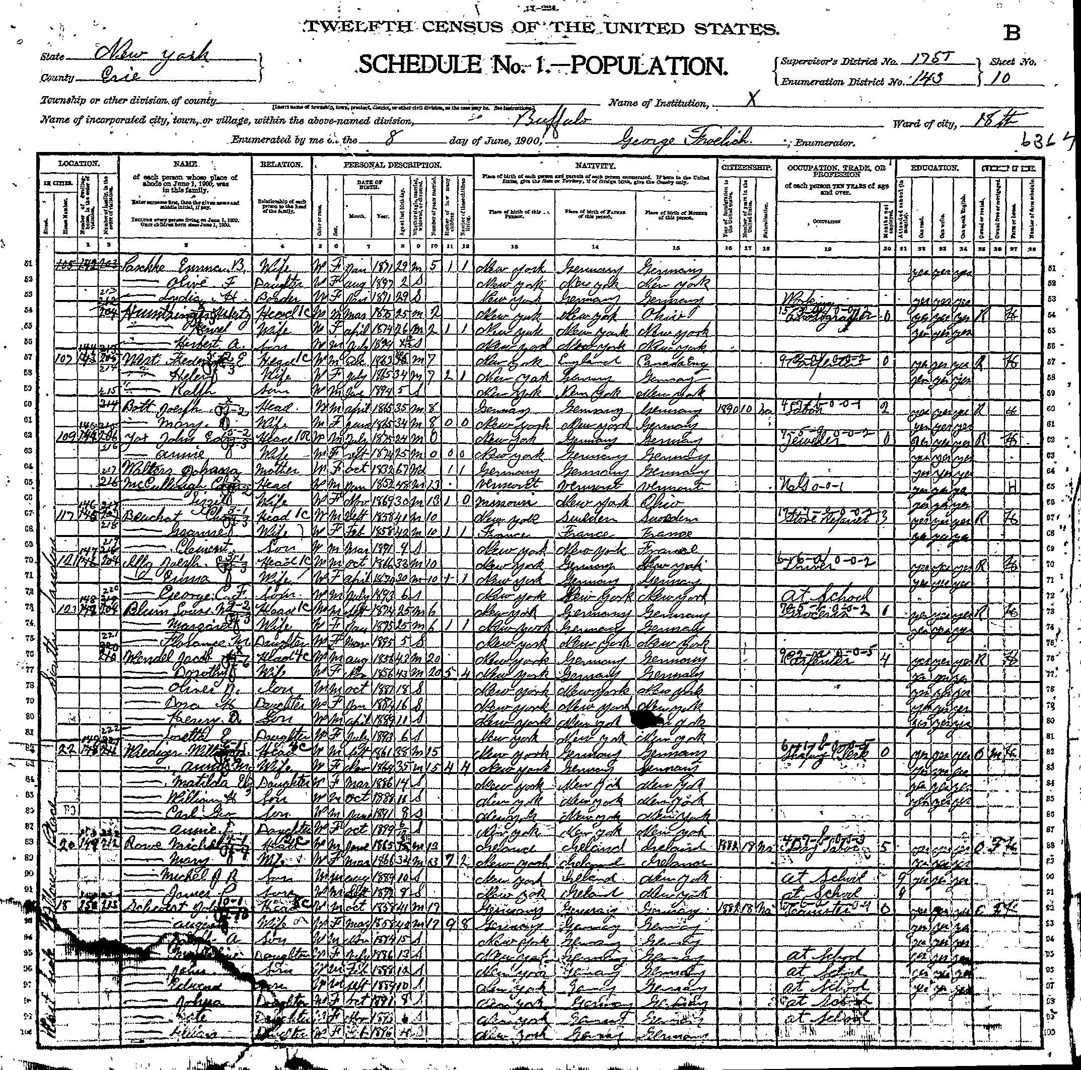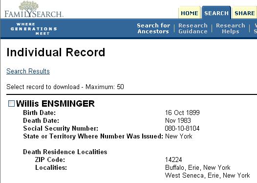 The obituary for Lillian’s father Johann (= "John") (1938) shows that she was at that time she was now married to Willis Edgar Ensminger. Willis, born on October 16, 1899, was a son of William and Annie Ensminger. Various Buffalo city directories show that Willis was a welder and that the couple resided at 10 Medford Place.