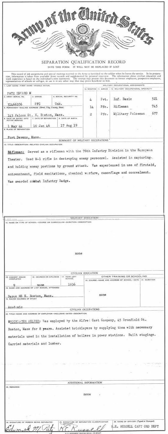 Edward's military records indicate that he attended public school in Boston, Masschusetts, completing coursework through the 9th Grade. On April 27, 1941, Edward married Geraldine Edith Marks. Geraldine was born in 1921 in Boston, Masschusetts. She was the daughter of Clifton S. Marks (native of Blue Hill, Maine) and Frances (née Oliver) Marks (native of Phippsburg, Maine). Up until 1942, when his daughter Frances was born, Edward worked as a bricklayer's laborer. He then became a bricklayer, in order to earn more money for his new family. Edward was inducted into the U.S. Army in 1944. During World War II, he served as a rifleman in Company C 385th Regiment, where he fought in Europe (battles and campaigns included Rhineland, Ardennes, and Central Europe). Edward was honorably discharged from military service on January 16, 1946. Frances (née Patz) Craig writes of her parents: After the war, Mom and Dad bought my grandmother's house at 143 Falcon Street in East Boston, where he lived for the rest of his life. He was very seriously burned in an accident in his back yard, lighting a charcoal grill, in 1970, and spent three months in the isolation burn unit at Massachusetts General Hospital, receiving several skin grafts, and several more months recuperating at home. He often joked about donating his body for an exhibit at the Smithsonian, because of the scarring on his trunk, arms and legs. He was not able to tolerate the chemicals used in bricklaying after that, so became a maintenance worker at Revere Memorial Hospital in 1971. He retired on disability in, I think, 1979, after his first heart bypass. He and Mom loved to camp and had a trailer in a campground in Rochester, NH. They also loved to travel, and took to spending their winters in Florida after they retired. He was always the life of every party, and had a large store of awful jokes. His greatest joy was his family, and he loved nothing more than holding his grandchildren and great-grandson in his lap and making them laugh. He had at least two heart attacks in 1986-7 and a second bypass in 1987, and suffered from congestive heart failure until his death in 1997. Edward died on September 20, 1997. He is interred in a plot adjacent to his parents at Woodlawn Cemetery, Everett, Massachusetts. The following is with reference to the award to Edward Martin Patz of the Combat Infantry Badge. This badge is usually awarded to a service man who faced personal combat/jeopardy in action during a war. The account is written by his daughter Frances (née Patz) Craig: "Dad was wounded by shrapnel (WW II), what he called a "Million Dollar Wound" in the shoulder. It didn't hit anything vital, but did cause stiffness enough to qualify him for a disabled vet abatement on his real estate taxes. (He knew about but never took advantage of that abatement until he was not able to work as a brickie any longer after his burn accident in 1970.) The Combat Infantry Award could have been for his service at the Battle of the Bulge? I know he fought there. I remember the scar quite well, a nasty looking puckered dent in the front of his shoulder and a surgical scar in the back where they removed the piece of shrapnel." This Military Service Record for Edward records both this badge, and his award of the Purple Heart medal. |