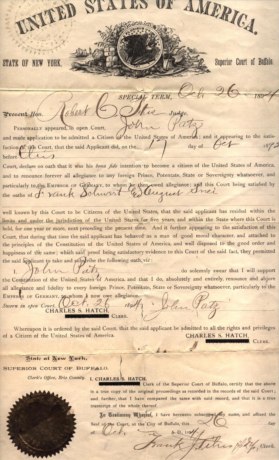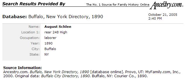 On May 12, 1878 at Kladau, West Prussia, Francisca married August J. Schlia. August was born in Lagschau on August 20, 1851. He was the son of Jacob and Anna (née Potrotz) Schlyia (note many variants for surname spellings of these families). The Catholic church ledgers of Kladau show that August was baptized as "August Michael Schlyia" on August 31, 1851. According to John Penberthy (son of Rita [née Schleer] Penberthy and great grandson of August and Francisca), August later in the Prussian army. He lost part of his hand or fingers in battle. On November 5, 1880 in Lagschau, Francisca gave birth to a daughter, Anna Susanna Schlia. With their infant daughter, Francisca and August emigrated to the United States. They departed Hamburg, Germany on March 25, 1881 aboard the S.S. Hamburg. The Hamburg departure records list them as: Traveling with them were Francisca's brother Franz (= "Frank") Carl Schwertfeger, his wife Julianne (= "Julia") (née Schlia) Schwertfeger (a sister to August) and their infant son Johann (= "John"). At Liverpool, England, both familes transferred to the S.S. Canada, arriving in New York City on April 13, 1881. A mis-transcribed passenger manifest lists the Schlias as follows: The same passenger manifest also mistakenly lists the Schwertfegers as "Schwerfegor." The two families settled in Buffalo, New York --- in a German neighborhood known as "The Fruitbelt" due to several of its streets being named after fruit trees. Francisca and August anglicized their names: Francisca became "Frances (née Schwert) Schlee." August became "August J. Schlee." Labels on a photograph imply that yet another sibling, "Mary" Schlia / Schlee, emigrated to the United States; however records of the marriage (June 25, 1890, St. Boniface R.C. Church, Buffalo) of Mary to Bernhart (= "Bernhard") Potratz demonstrate that the maiden name of Mary's mother was "Koschmieder," while the maiden name of the mother for August and Julianna was "Potrotzka." Thus Mary was likely not a direct sibling of August and Julianna. (See further information, below). According to the Buffalo City Directory, August and Francisca resided in 1890 at 248 High Street (white building) -- apparently next door to Johann (John) and Maria (Mary) (née Schwertfeger) Patzke/Patz), who resided at 250 High Street. During their later years, August and Francisca resided at 255 Locust Street (now a vacant lot) in Buffalo, New York. They raised six children. Despite the implications of the 1900 Census, where it states that four of the four existing children still survived, there is an 1895 baptismal record for Jacob Michaëlew Schlia -- apparently a child who did not survive until the 1900 census. August died of pneumonia on June 5, 1923, at the age of 71 (the cemetery records state that he died on June 6th). Francisca died of pneumonia on May 17, 1936, at the age of 79. At the time of her death, she resided at 375 Florida Street in Buffalo (the street address on her interment record is in error). Both Francisca and August are interred in Lot 112, Sec. 8C, United German & French Cemetery (Pine Hill) in Cheektowaga, NY.