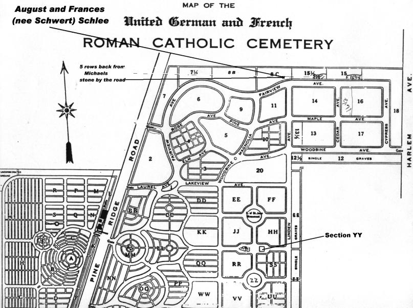 General location of the gravesites of Francisca (née Schwertfeger/Schwert) and August Schlia/Schlee, Lot 112, Sec. 8C, United German & French Cemetery, Cheektowaga, NY. A map to the gravesite is available here.