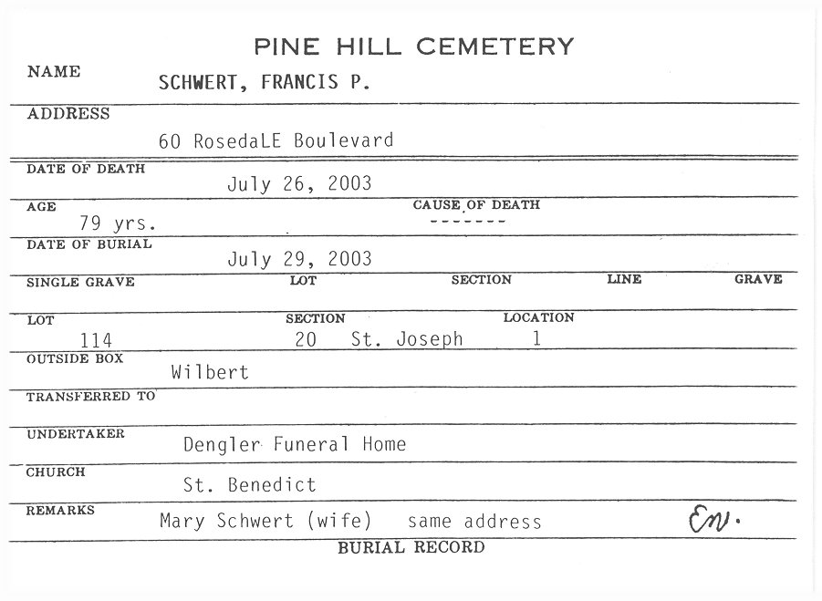 Grave of Francis Paul Schwert, Lot 114, Section 20, United German & French Cemetery (Pine Hill), Cheektowaga, NY.