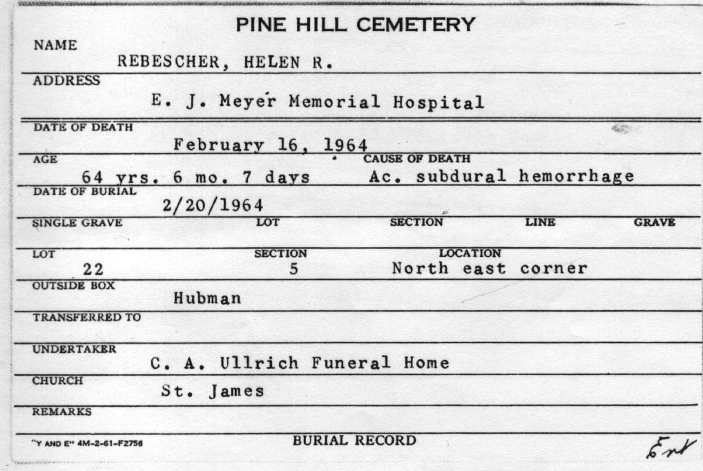 Grave of Helen Rose Rebescher, Lot 22, Sec. 5, United German & French Cemetery (Pine Hill), Cheektowaga, NY.