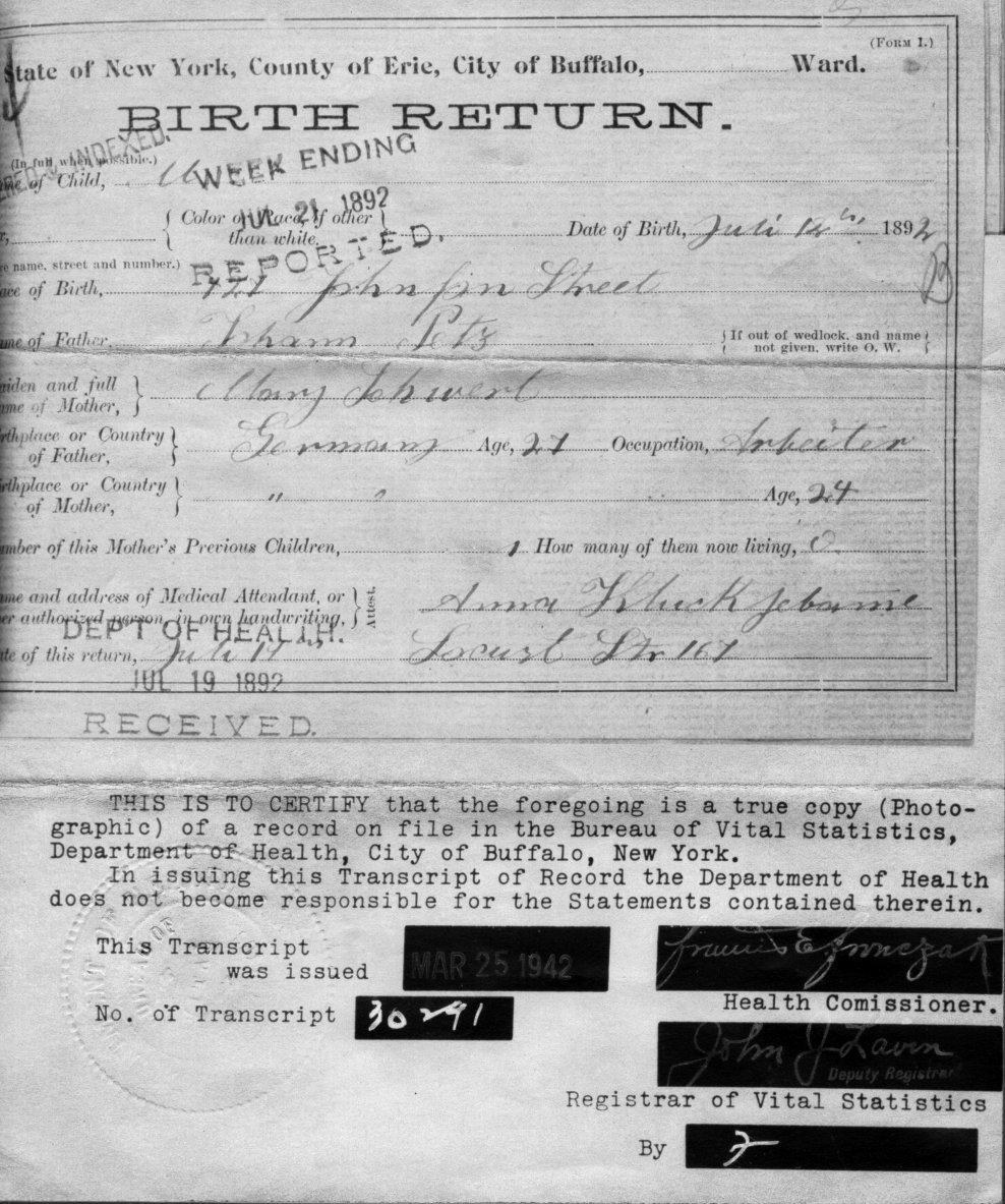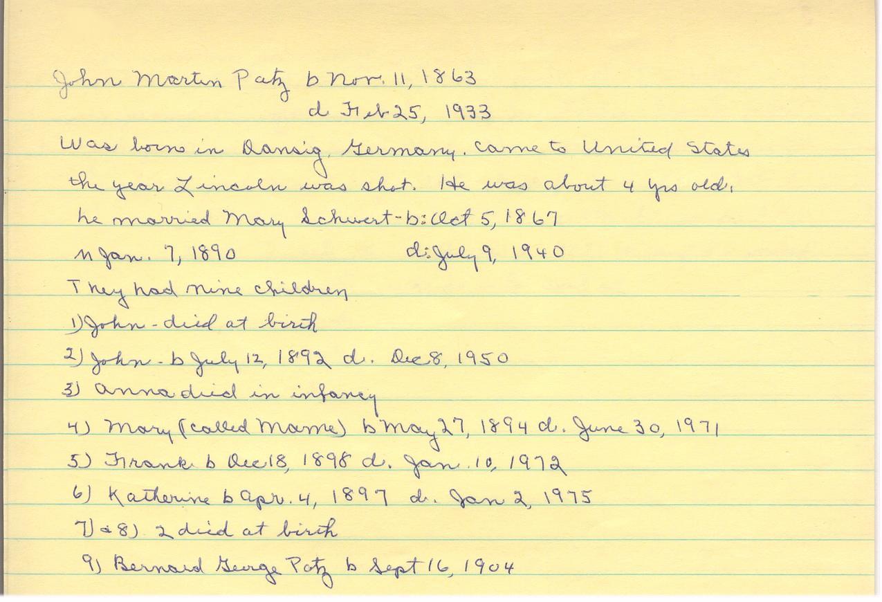 The birth certificate for John Joseph Patz, born July 12, 1892 (and the couple's first surviving child), shows that Mary lists only one previous child -- most likely this was August Jacob Patz, who had died at birth. This lends credence that "John Patz (born 1891?)" was the result of a miscarriage. Per Bernard Patz, "The only proof of his existence are my Mom's notes . . . what she told me verbally . . . that they had a baby John who died, and they named the next child John. In addition, the 1900 U.S. Census that shows John and Mary had seven children at the time, with four still living."