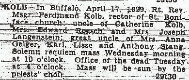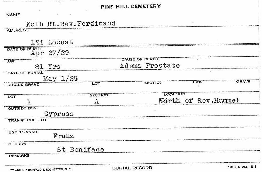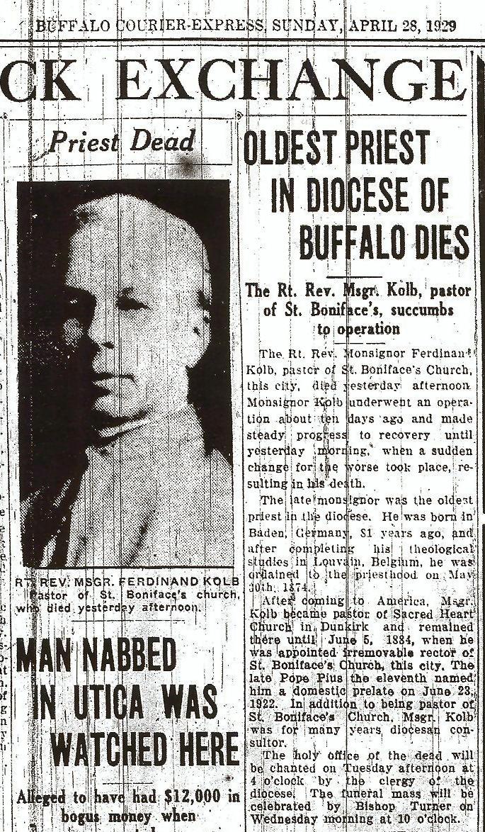 Rev. Msgr. Ferdinand J. Kolb Saint Boniface R.C. Church Buffalo, New York (1884 - 1929) Born: 17 October, 1847, Erfeld, Baden-Württemberg, Germany