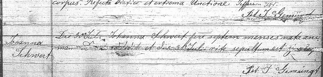 - Johanna Schwert: Church record of the death of Johanna Schwert, died July 30, 1891, age 7 months; interred July 31, 1891. Record is from the death ledger of Saint Boniface R.C. Church, Buffalo, New York. No parentage is indicated.