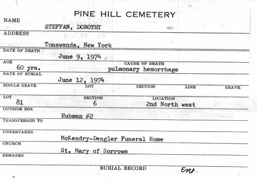 • Interment Record: Dorothy (née Schwert) Steffan, Lot 81, Section 6, United German & French Cemetery (Pine Hill), Cheektowaga, NY.