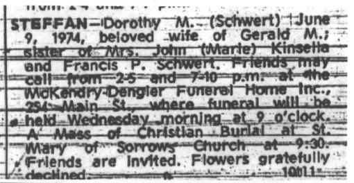 • Obituary: Dorothy (née Schwert) Steffan, June 9, 1974.