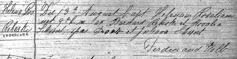 • Baptismal Record: Helen Rose Rebeski, born on August 9, 1899. Baptized by Fr. Ferdinand Kolb of Saint Boniface R.C. Church on August 13, 1899. Sponsors were Franz (= "Frank") and Julia (née Schlia/Schlee) Schwertfeger/Schwert.