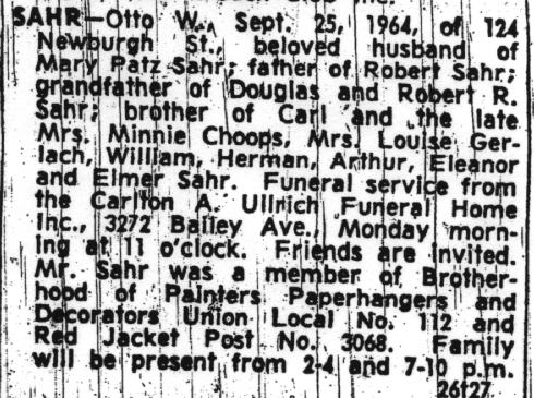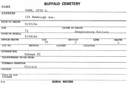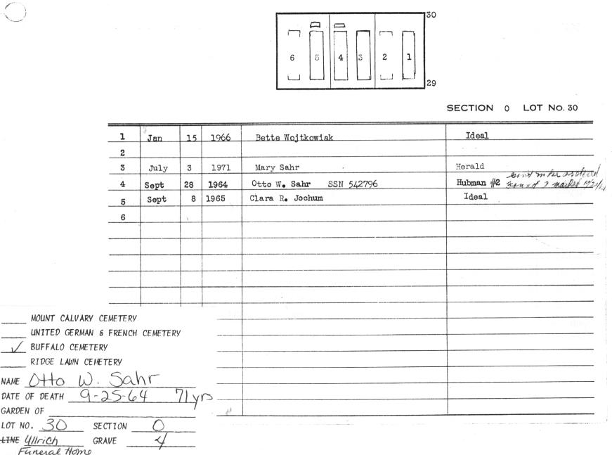• Interment Record: Otto W. Sahr, Sec. O, Lot 30, Buffalo Cemetery (Pine Hill), Cheektowaga, NY.