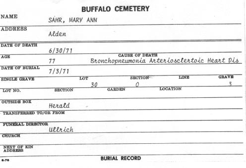 • Interment Record: Mary Sahr, Sec. O, Lot 30, Buffalo Cemetery (Pine Hill), Cheektowaga, NY.