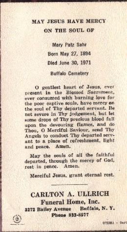 • Funeral Mass Card: Mary (née Patz) Sahr, born May 27, 1894, died June 30, 1971.