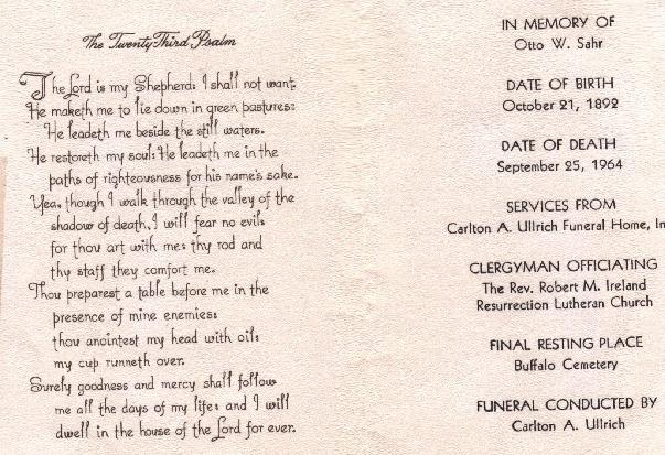 • Funeral Mass Card: Otto W. Sahr, born October 21, 1892, died September 25, 1964.