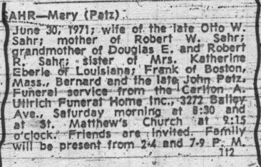 • Obituary: Mary (née Patz) Sahr, died June 30, 1971.